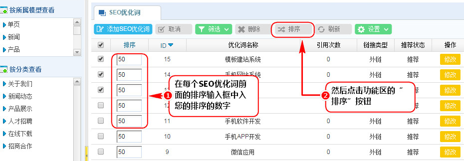 1、在SEO优化词管理列表区,在每个SEO优化词前面的排序输入框中入您的排序的数字,然后点击功能区的“排序”按钮。